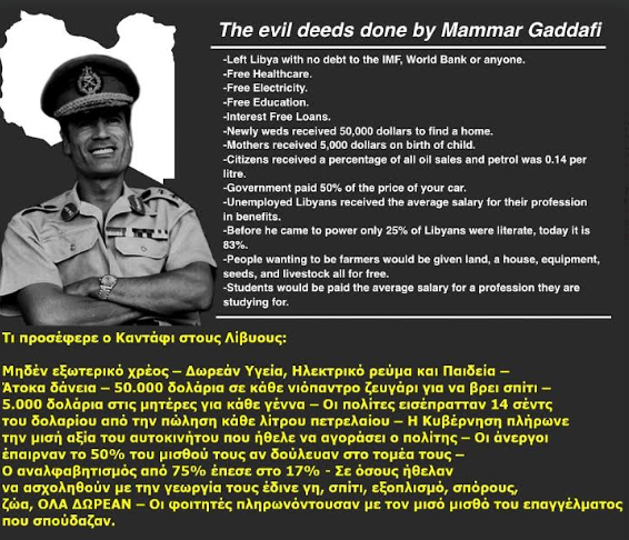 Αυτό μας είπαν. Αυτό που δεν μας είπαν είναι ότι o Καντάφι σχεδίαζε να επαναφέρει τον κανόνα του χρυσού σε ένωση αφρικανικών χωρών και ότι μόλις δολοφόνησαν τον Καντάφι το πρώτο αεροπλάνο που προσγειώθηκε στην Λιβύη ήταν αυτό που μετέφερε αξιωματούχους του Διεθνούς Νομισματικού Ταμείου και τροποποιήθηκε το καταστατικό της Κεντρικής Τράπεζας της Λιβύης με τον Νόμο 46, του 2012.