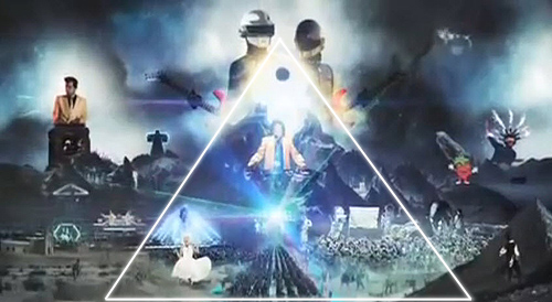 Εδώ κρύβεται μια πυραμιδική μορφή (η οποία επισημαίνεται με λευκές γραμμές). Στη βάση είναι χορευτές (ή οι μάζες) και στην κορυφή είναι ένα φωτεινό επιστέγασμα και η Ηλιακή έκλειψη που ενεργεί ως το μάτι στην πυραμίδα.Τα κύρια στοιχεία αυτού του ταμπλό είναι Daft Punk, ένα δίδυμο που συχνά μας δείχνει με όχι και τόσο διακριτικούς συμβολισμούς.