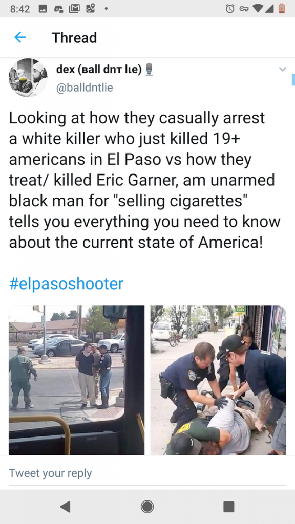 Στο παρακατω τουιτ θα δειτε μια συγκριση σε συλληψη ενος αφροαμερικανου που πουλαει παρανομα τσιγαρα και την συλληψ ενος ανθρωπου που μολις σκοτωσε 19 ανθρωπους ..!
